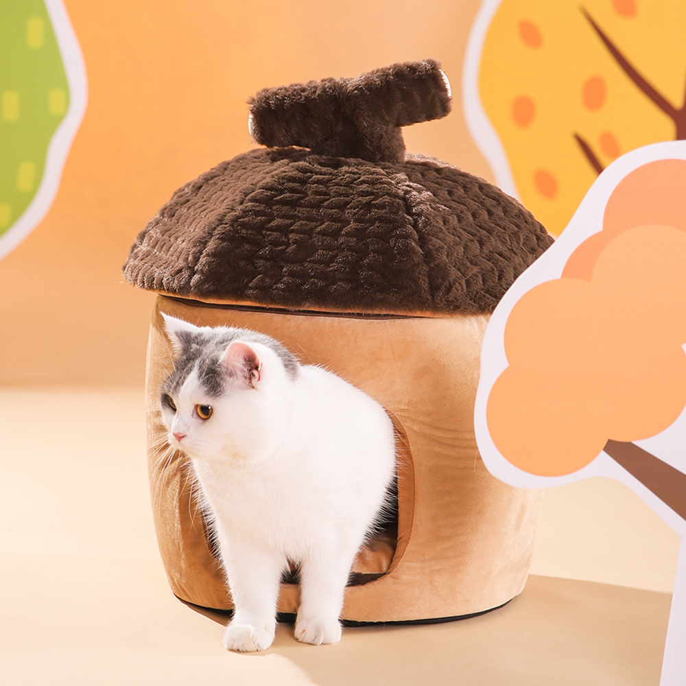 Give your cat a cozy and secure retreat with our adorable Acorn Hideaway Cat Bed. This unique, acorn-shaped cave is designed to give your feline friend a private space to curl up, nap, and feel safe.