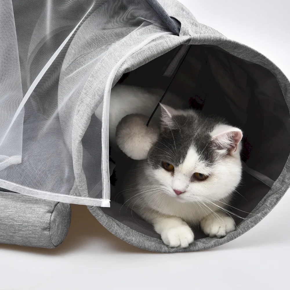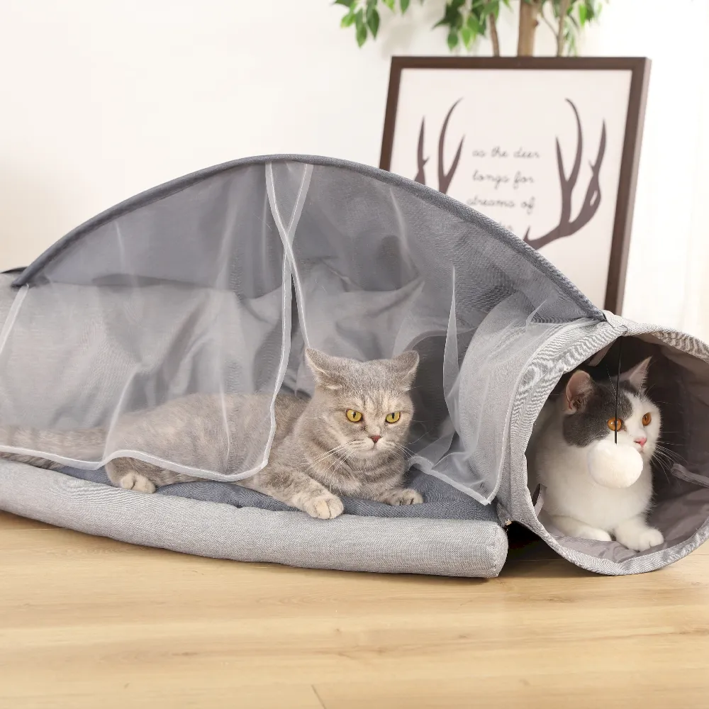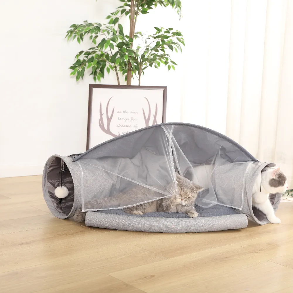 This cat bed tunnel offers 3-in-1 functionality with a collapsible design, plush sleeping space, zipper-convertible tunnel, and interactive toy ideal for modern pet retailers seeking versatility and fun.
