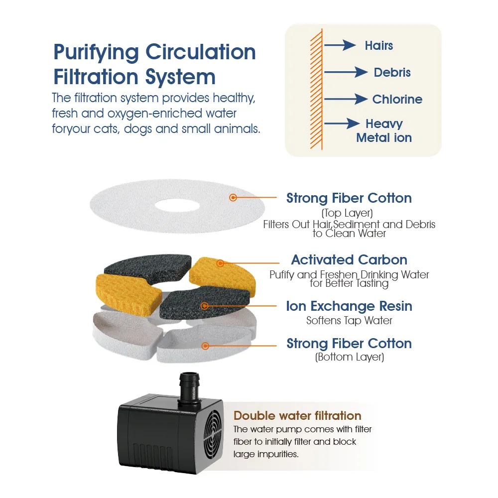 - Advanced Filtration System for Cleaner Drinking Water ??This cat fountain water bowls set features a purifying circulation filtration system that removes hair, debris, and odors to ensure fresh, clean water.