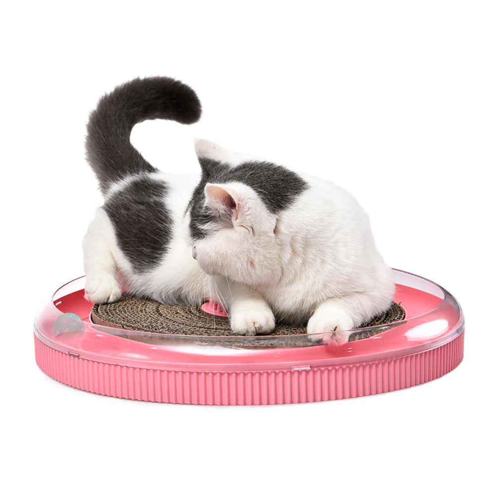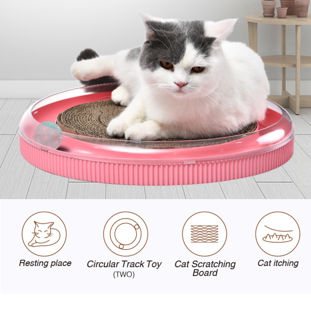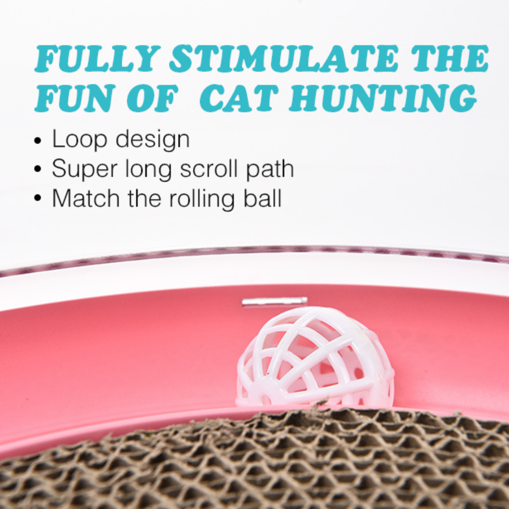This cat scratching board features a round, spacious design that encourages your cat to stretch, scratch, and play. The shape provides ample space for your cat to satisfy their natural scratching instincts, helping prevent damage to your furniture. It’s designed to appeal to cats of all sizes, offering them an ideal spot to sharpen their claws. - Interactive Ball Tracks for Play