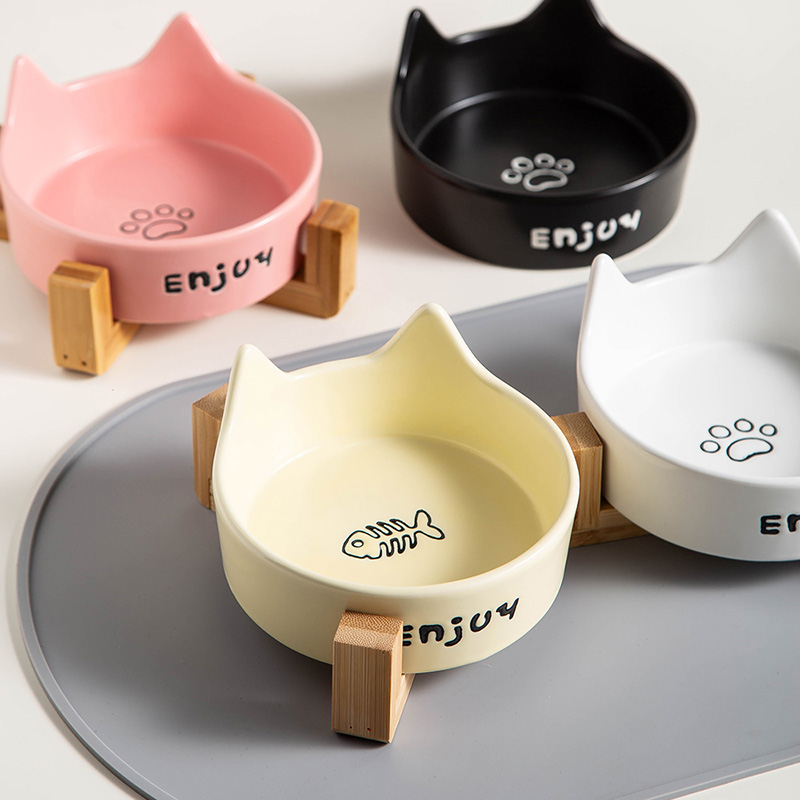 Featuring adorable cat ears and available in four delightful colors, this ceramic pet bowl is a stylish and charming way to serve your pet. For added comfort, the bowl can be paired with an optional wooden stand, making mealtime easier for your furry friend.