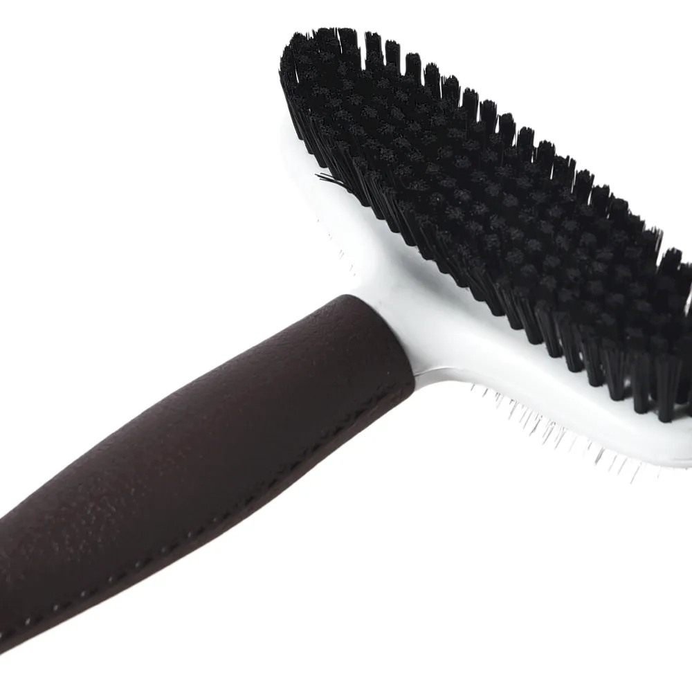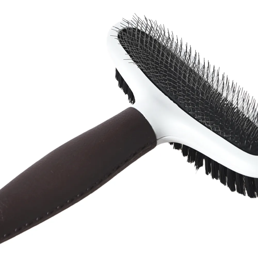 - Dual-Sided Design: This brush features two sides—one with fine bristles for detangling and removing loose hair, and the other with soft pins for smoothing and finishing your pet’s coat.