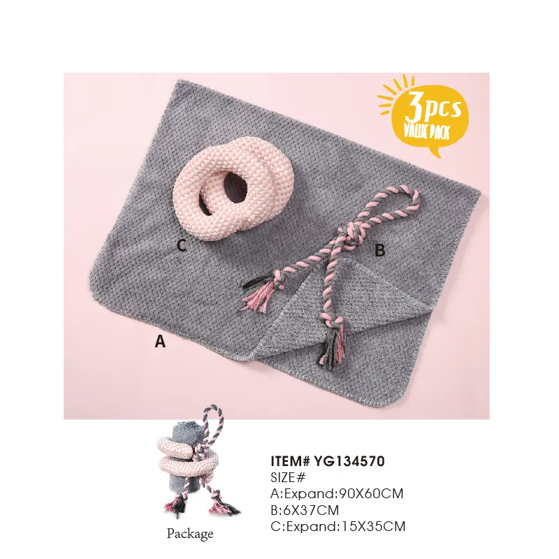 - Complete 3-Piece Set This all-in-one dog toy sets include a dog blanket, a plush toy, and a rope chew toy, covering all play and comfort needs. With this comprehensive set, dogs will always have something to keep them entertained and relaxed.