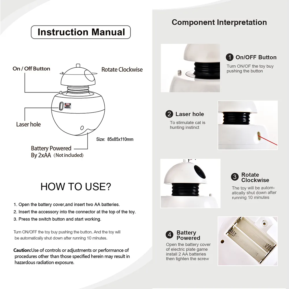 - Battery Powered You will find the battery-powered operation very convenient. This electric cat toy runs on standard batteries, making it easy to set up and maintain. You can quickly replace the batteries when needed, ensuring continuous playtime for your cat.