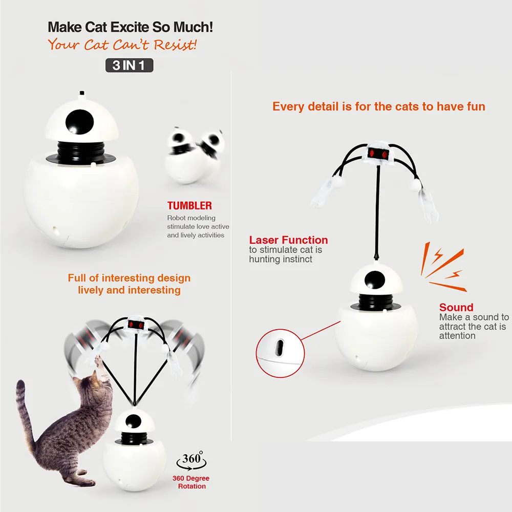 - Robot Tumbler Design You will love the unique robot tumbler design of this electric cat toy. Its clever structure allows it to wobble and stay upright, captivating your cat’s attention and stimulating playful behavior. This innovative design ensures hours of fun and engagement for your feline friend.