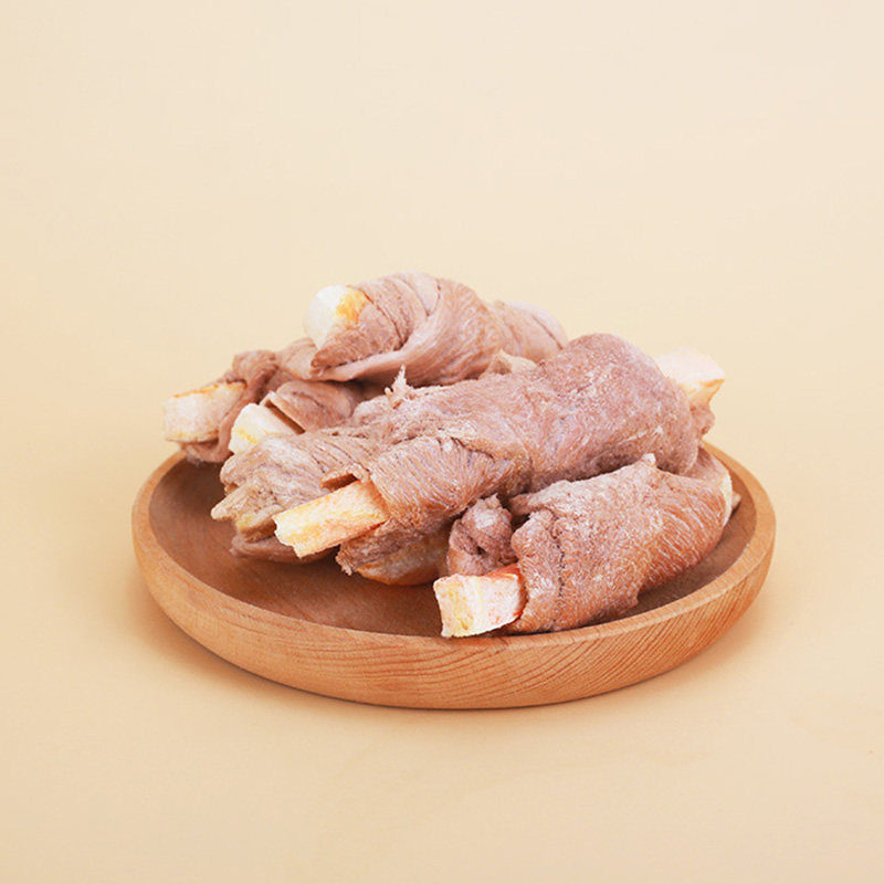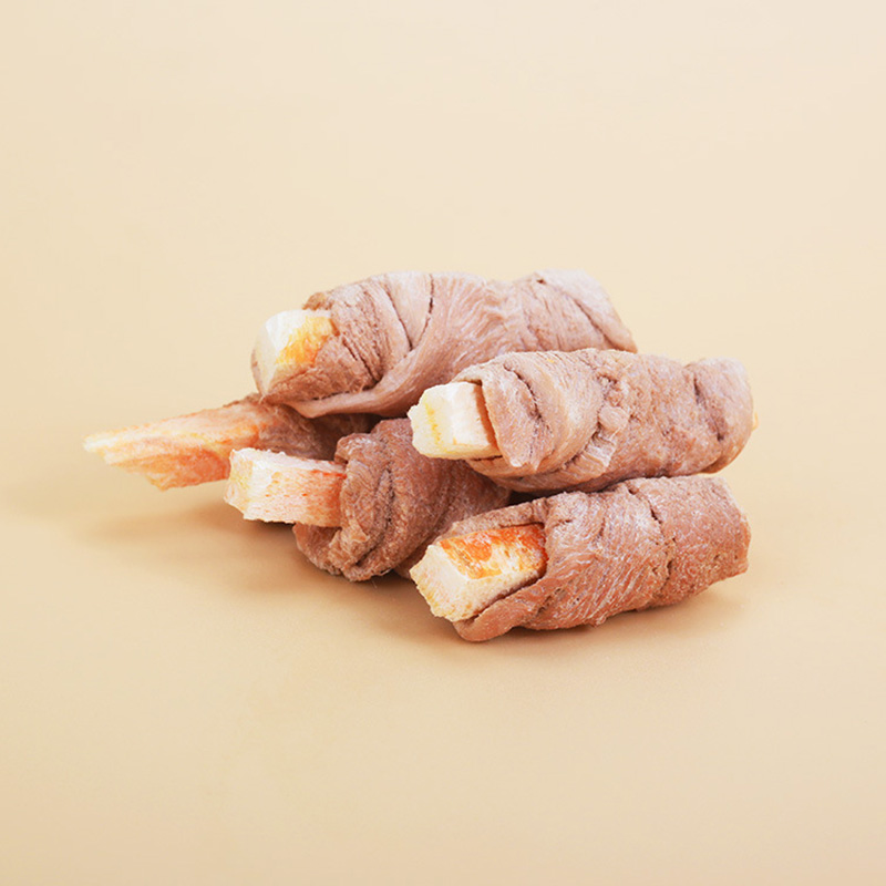These are high-protein, two-ingredient freeze-dried dog treats featuring savory duck meat wrapped around a crunchy carrot stick, offering a clean, nutritious, and flavorful chew that can be customized to your specific packaging needs.