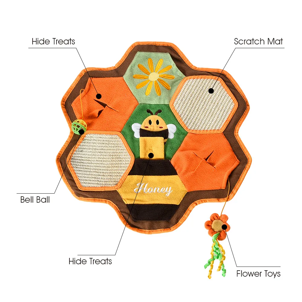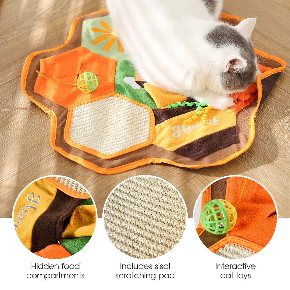 This funny cat toy combines a honeycomb puzzle, scratch mat, and interactive treat game to deliver engaging indoor fun and healthy stimulation for cats.
