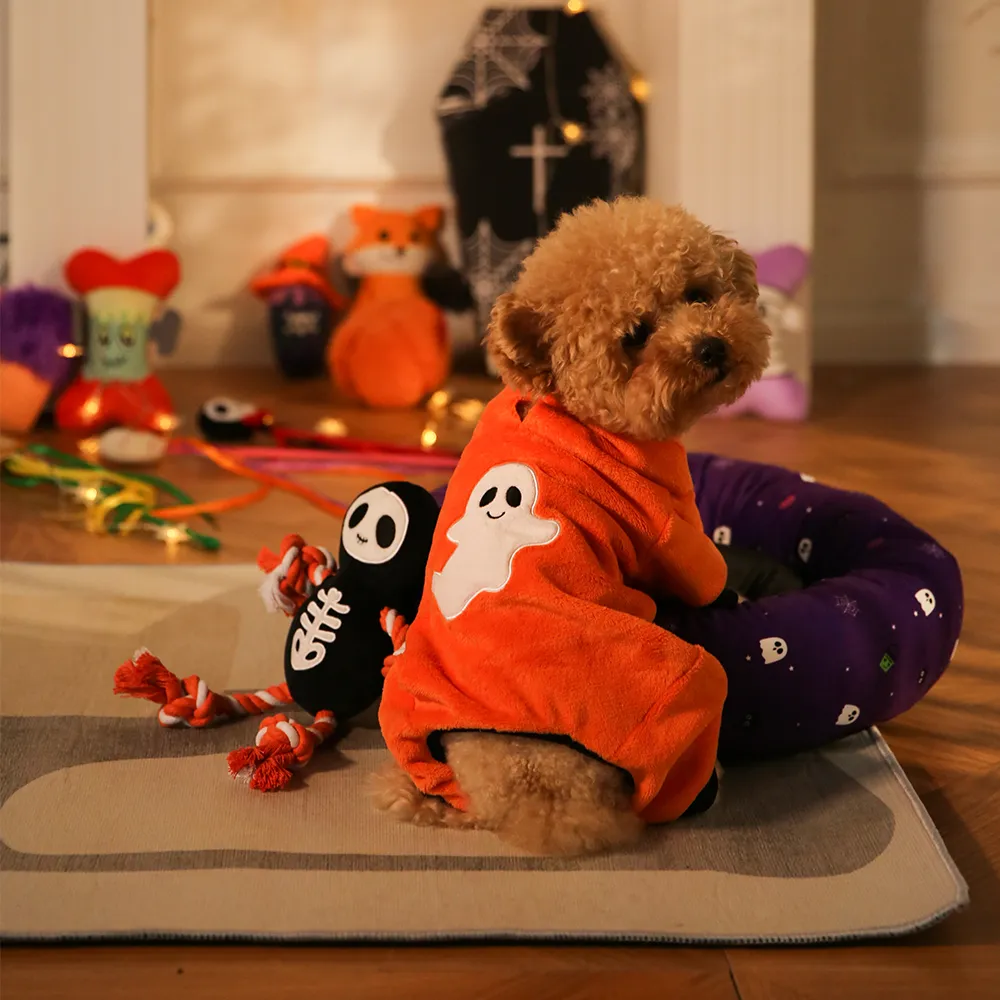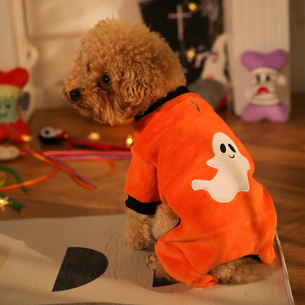 The Halloween Dog Clothes Cute Ghost Style is a cozy and festive long-sleeve jacket that keeps your pet warm and stylish for Halloween celebrations.