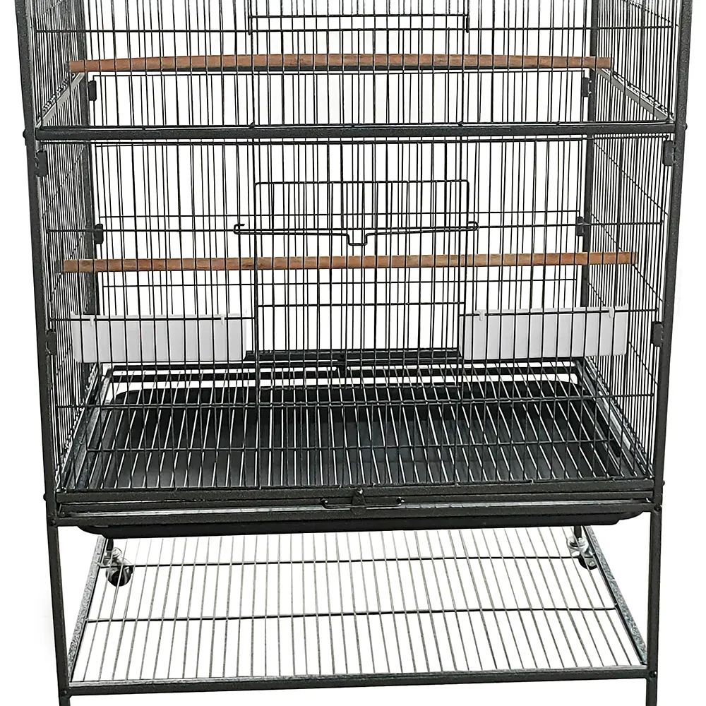 This huge bird cage combines a spacious metal structure, dual-door access, multiple feeding trays, and built-in wheels—perfect for housing large birds in professional environments.