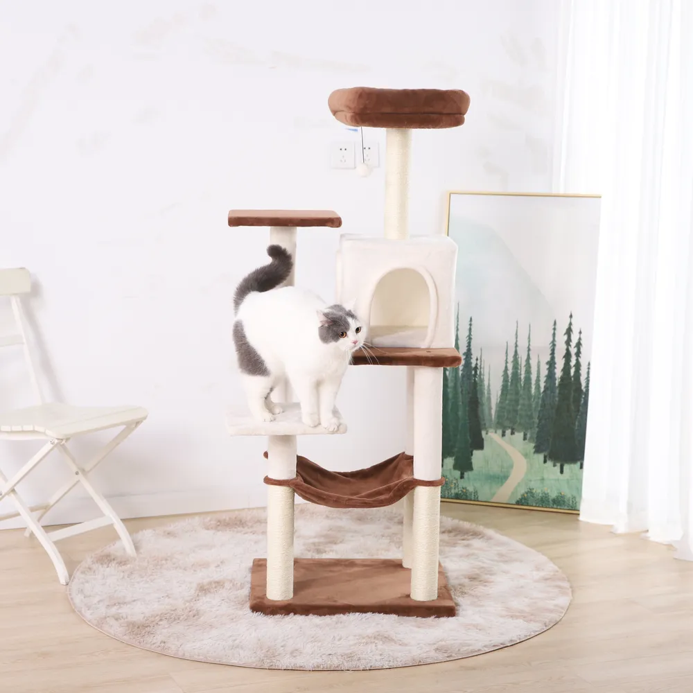 5.Hanging Bed for Playful Adventures The hanging bed is a unique and exciting addition to our cat climbing tree. Cats can leap into the bed and sway gently, adding an extra layer of excitement to their playtime and exploration.