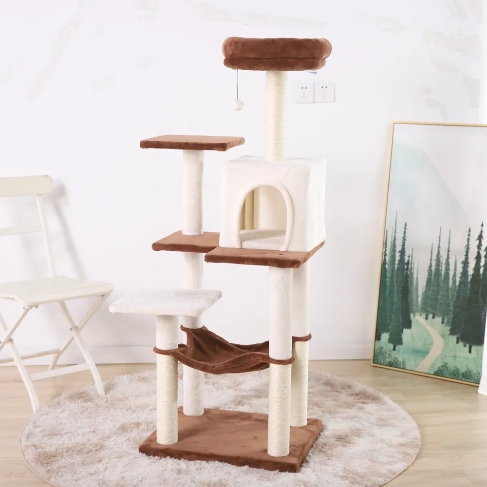 2.Sleep Condo for Cozy Retreats Every cat needs a private and cozy retreat, and our cat climbing tree provides just that with its sleep condo. Cats can curl up inside for uninterrupted rest and relaxation. The spacious interior ensures ample room for comfort.