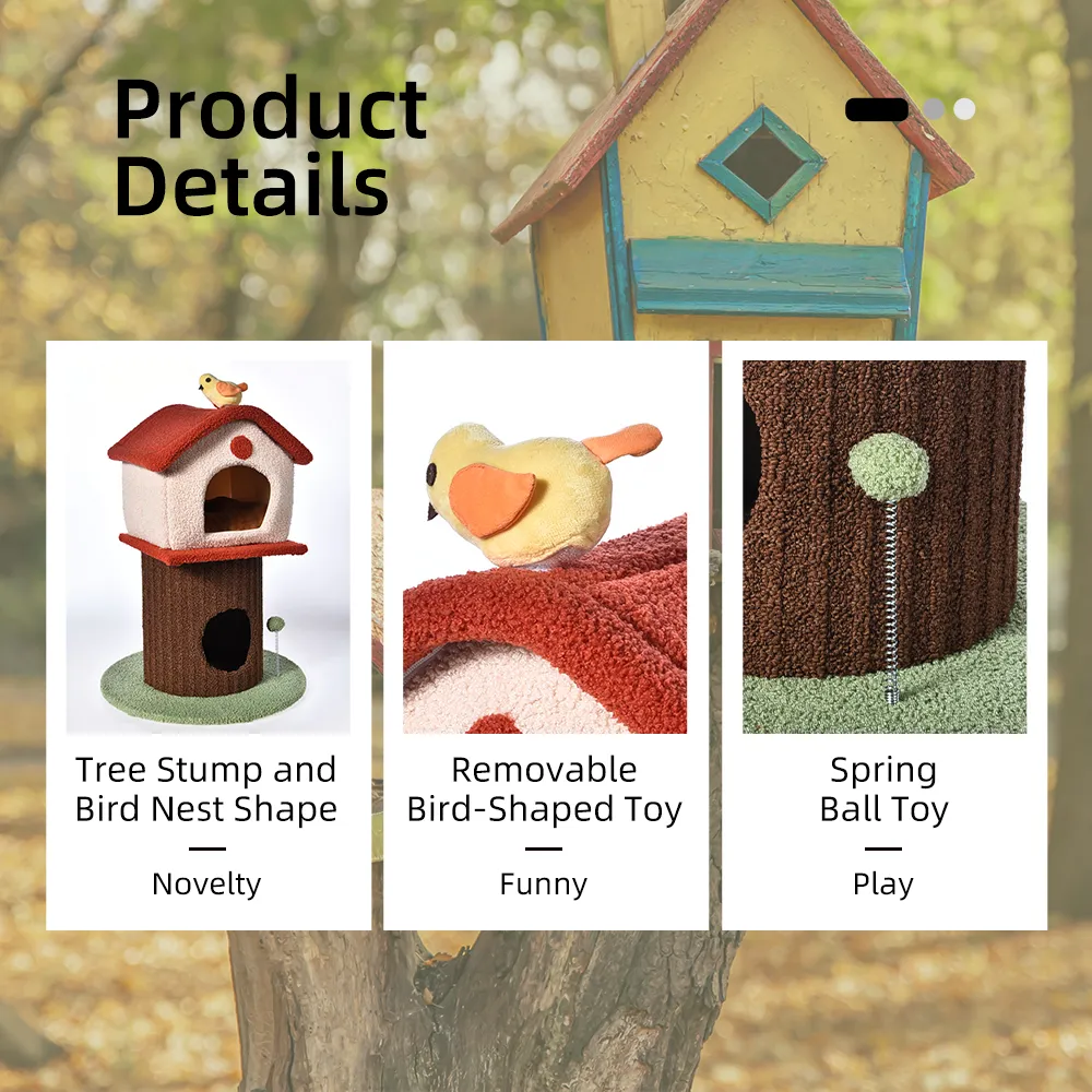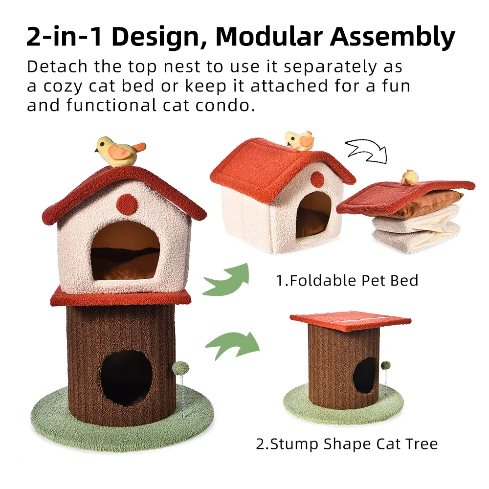 Unique Tree Stump Bird House Design: This cat tree features a creative and whimsical bird house shape, combining functionality with a fun, nature-inspired design. Its unique structure serves as both a cozy cat condo and an eye-catching decor piece for your home.