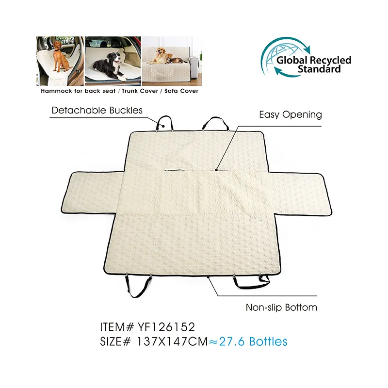 - Environmentally Friendly Materials. Committed to sustainability, our pet car covers is made from recycled materials. By utilizing eco-conscious materials, we not only contribute to environmental conservation efforts but also provide pet owners with a guilt-free solution for traveling with their furry companions.