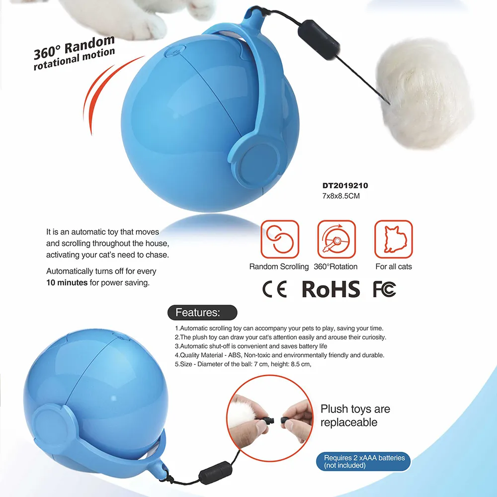 The Rolling Ball Cat Toy is an interactive electronic toy that rolls in random directions, keeping your cat entertained and engaged. With a replaceable plush tail, it offers dynamic play for hours of fun.