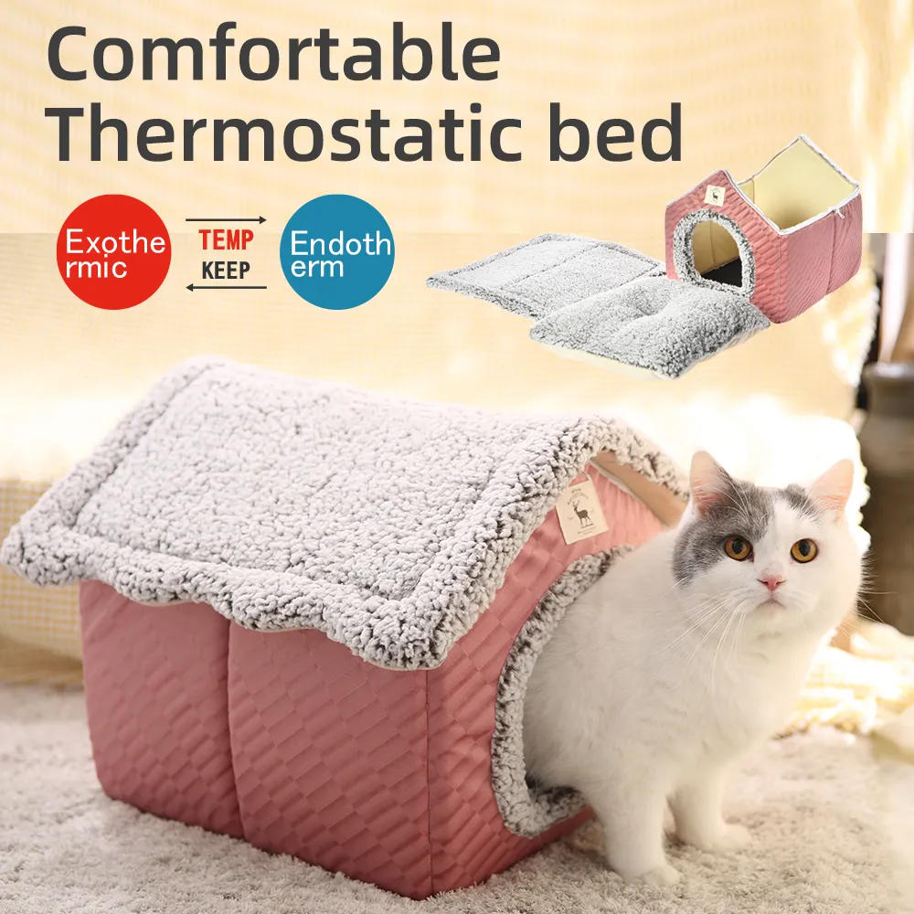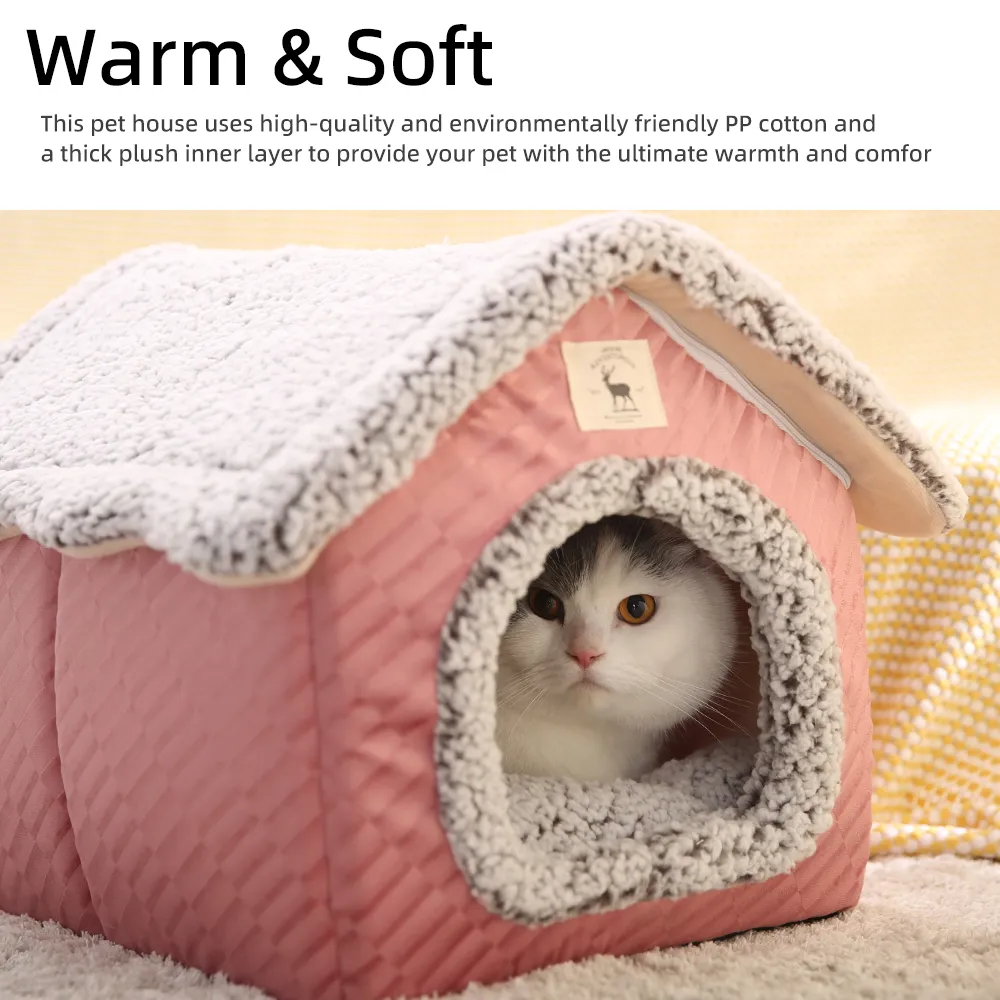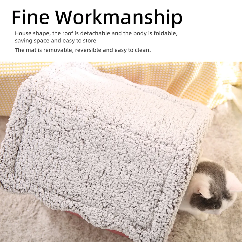 - House-Shaped Design You will love the charming house-shaped design of this pet bed. The adorable house shape not only adds a decorative touch to your home but also creates a snug and secure environment for your cat. This design mimics a natural hiding spot, making your pet feel safe and protected.