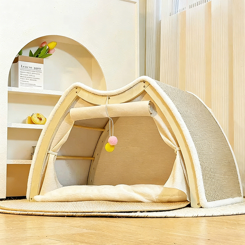 Built with a solid wood frame, this tent offers rock-solid stability that won’t collapse during high-energy play. When not in use, the foldable design allows for effortless storage. Inside, your cats will find a 360° wrap-around thermal haven, complete with a buttery-soft plush cushion that locks in heat for the ultimate nap. It’s more than just a bed; it’s a durable, warm, and stylish fortress for your pets.