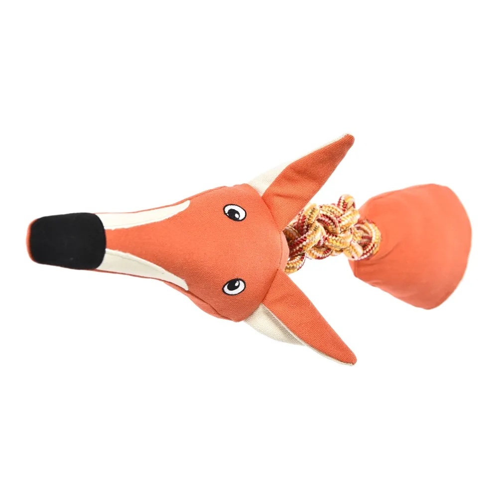 Squeaky Red Fox Dog Toy Stretch Tug Rope Wtih White Label