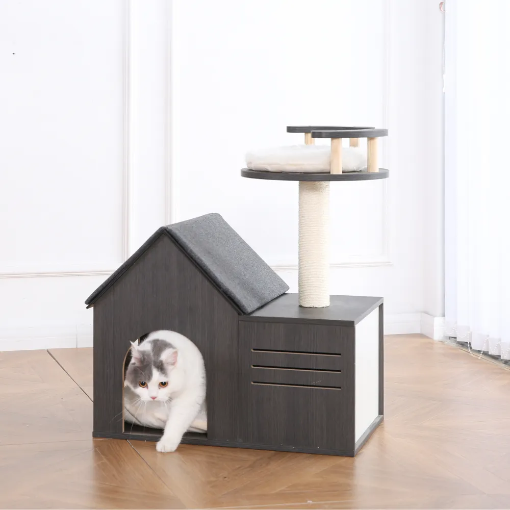 Wooden cat furniture two holes soft plush sleep condo features a sisal scratching post, a cozy house-shaped sleeping condo, and a cushioned top platform, offering the perfect combination of comfort, scratching, and relaxation for cats.